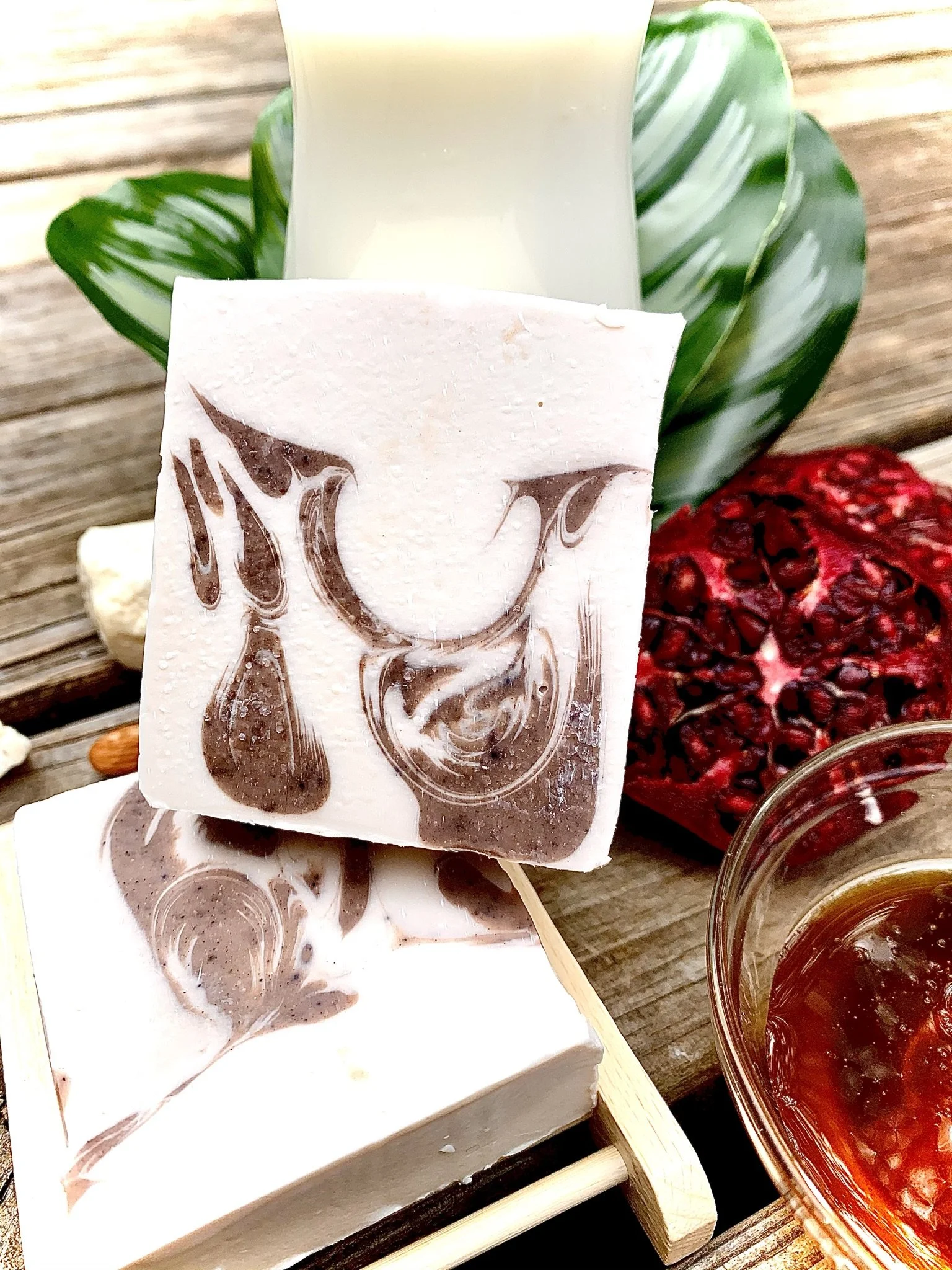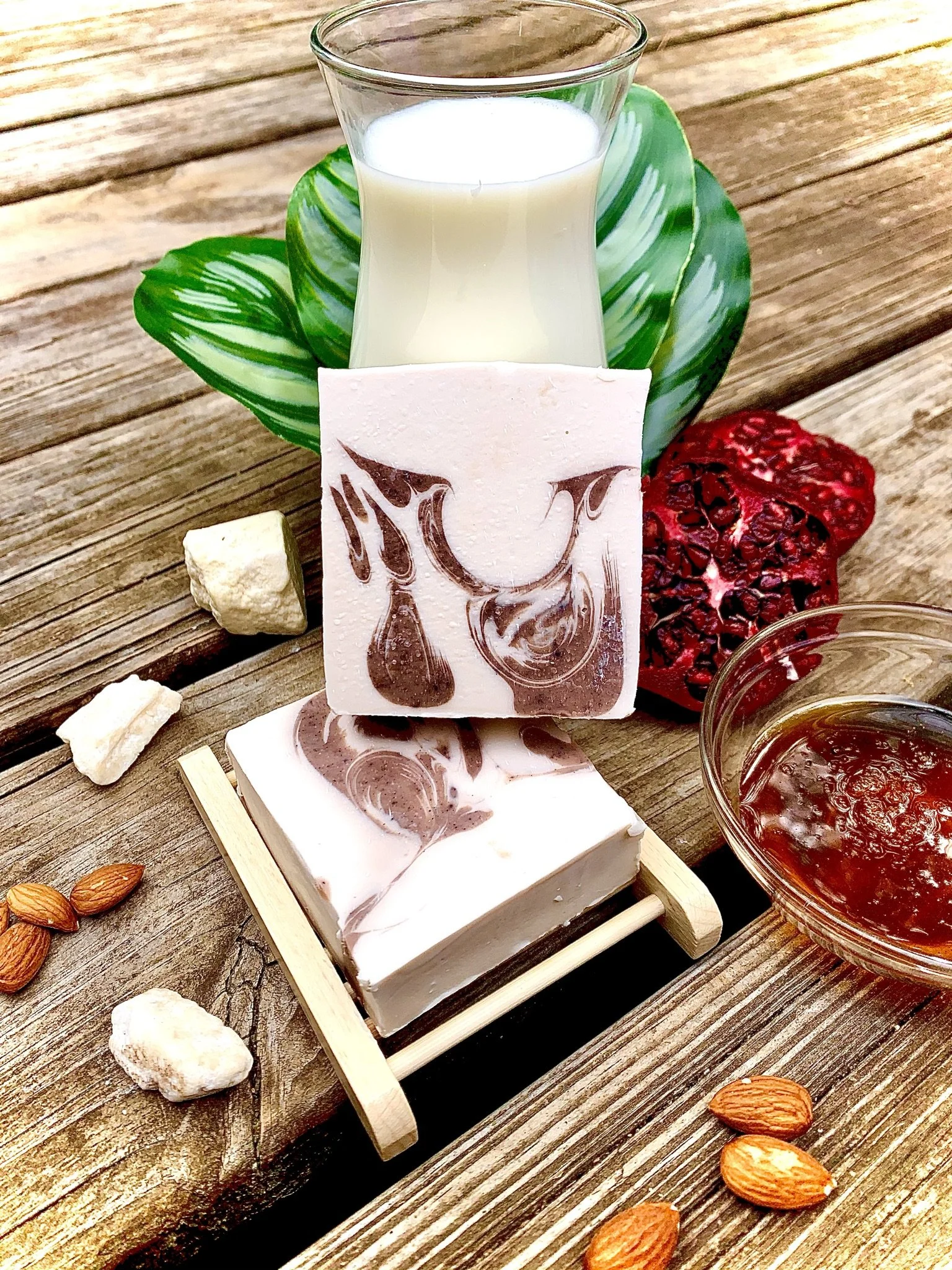 Indulge your skin with the nourishing power of our Almond Milk Soap Bar, enriched with a high source of vitamin E, along with vitamins C and D. This luxurious bar helps reduce early signs of aging and skin discoloration while providing deep hydration. Infused with local Georgia honey, one of nature's finest skin remedies, it enhances skin softness and radiance. The classic scent of fresh, fruity pomegranate, blended with notes of cherry, grape, citrus, sweet strawberry, and amber, adds a delightful touch to your skincare routine.